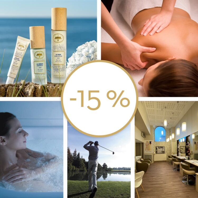 - Les soins de Thalassothérapie & Spa (hors forfaits Spa et chèques cadeaux) : profitez de cette remise pour découvrir toute une gamme de soins pour votre bien-être. Découverte thalasso 2, 3 ou 4 soins, soins Spa à la carte…